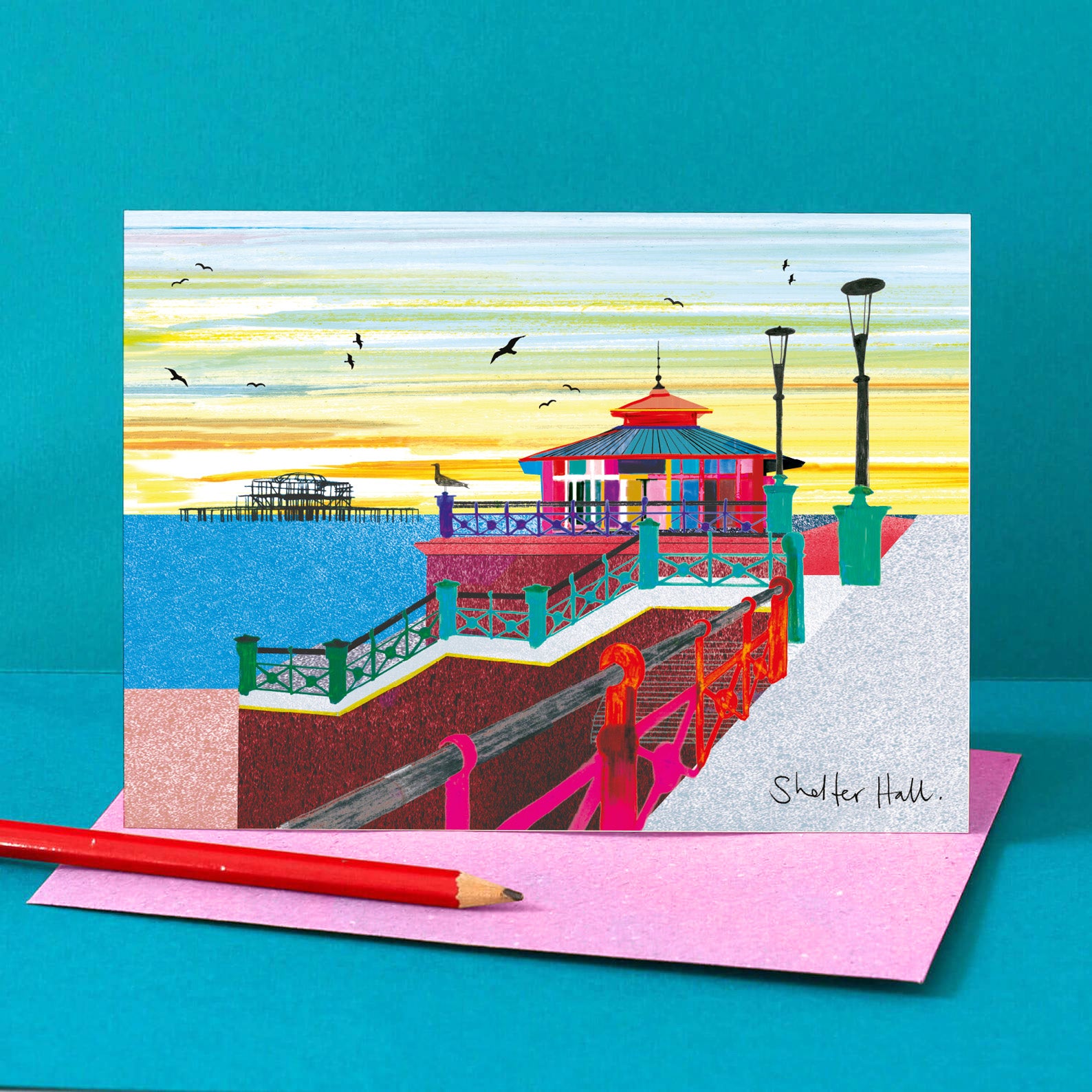 This colourful I Drew This Brighton Shelter Hall card It is part of our award winning Landmarks range, featuring cityscapes and landmarks from Brighton, Sussex, London and across England, Scotland, Wales and Ireland.