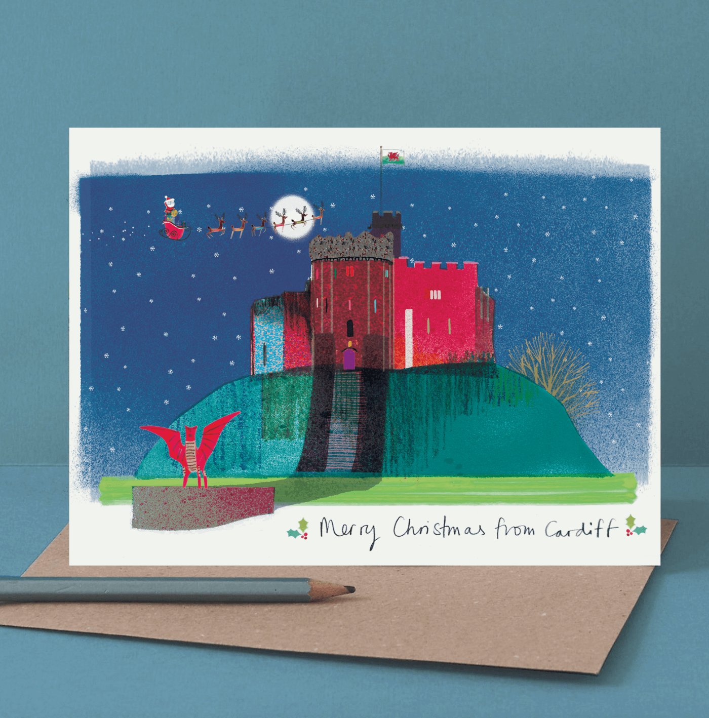 Uniquely designed by Ilona Drew this stunning Christmas card featuring Cardiff Castle has been printed in the UK on quality 350gsm board and measuring 178mm x 130mm.