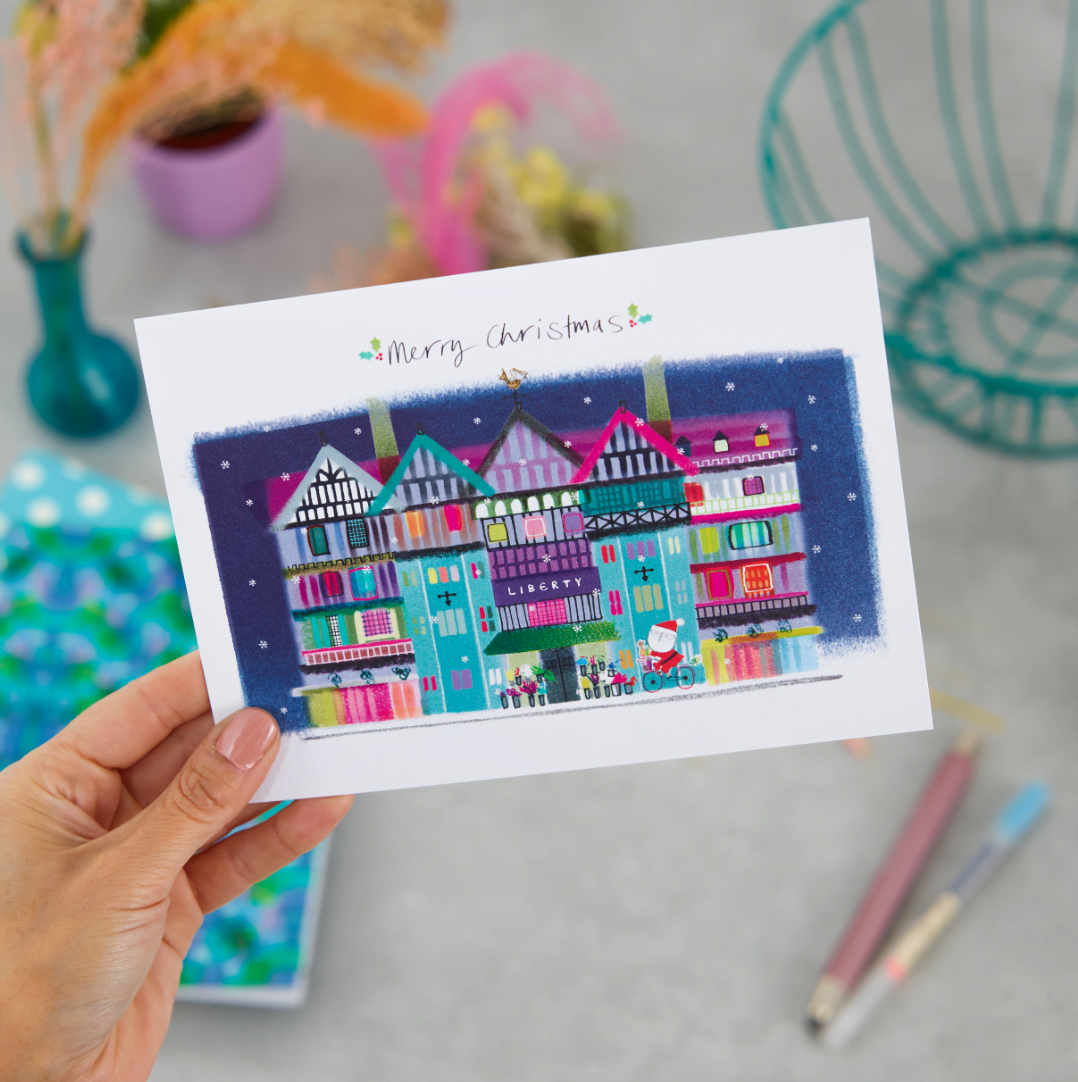 Liberty of London has been captured in beautiful winter colours in Ilona's Christmas card illustration of the historic London department store.