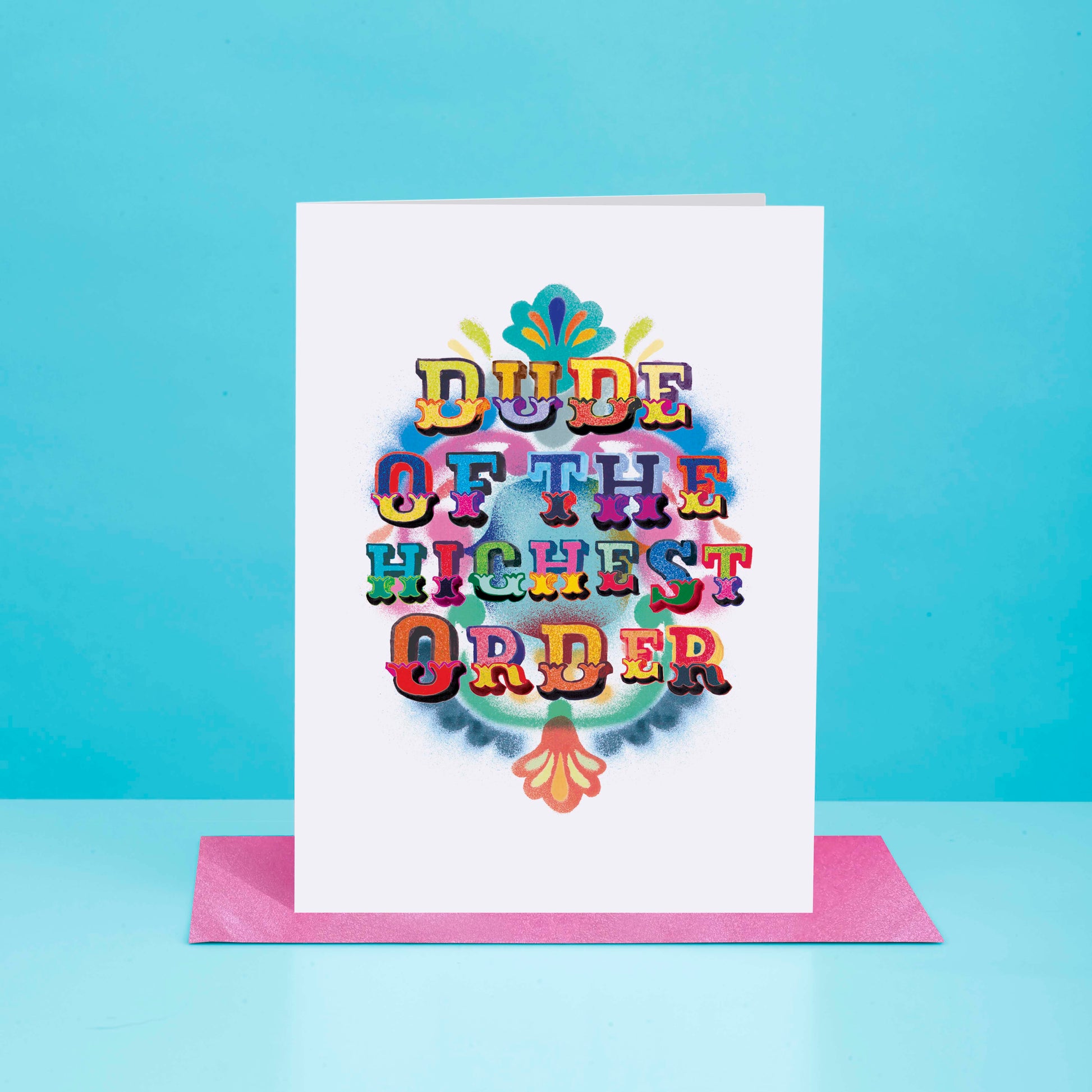 Grab this fun and vibrant typography Dude Of The Highest Order Greetings card.