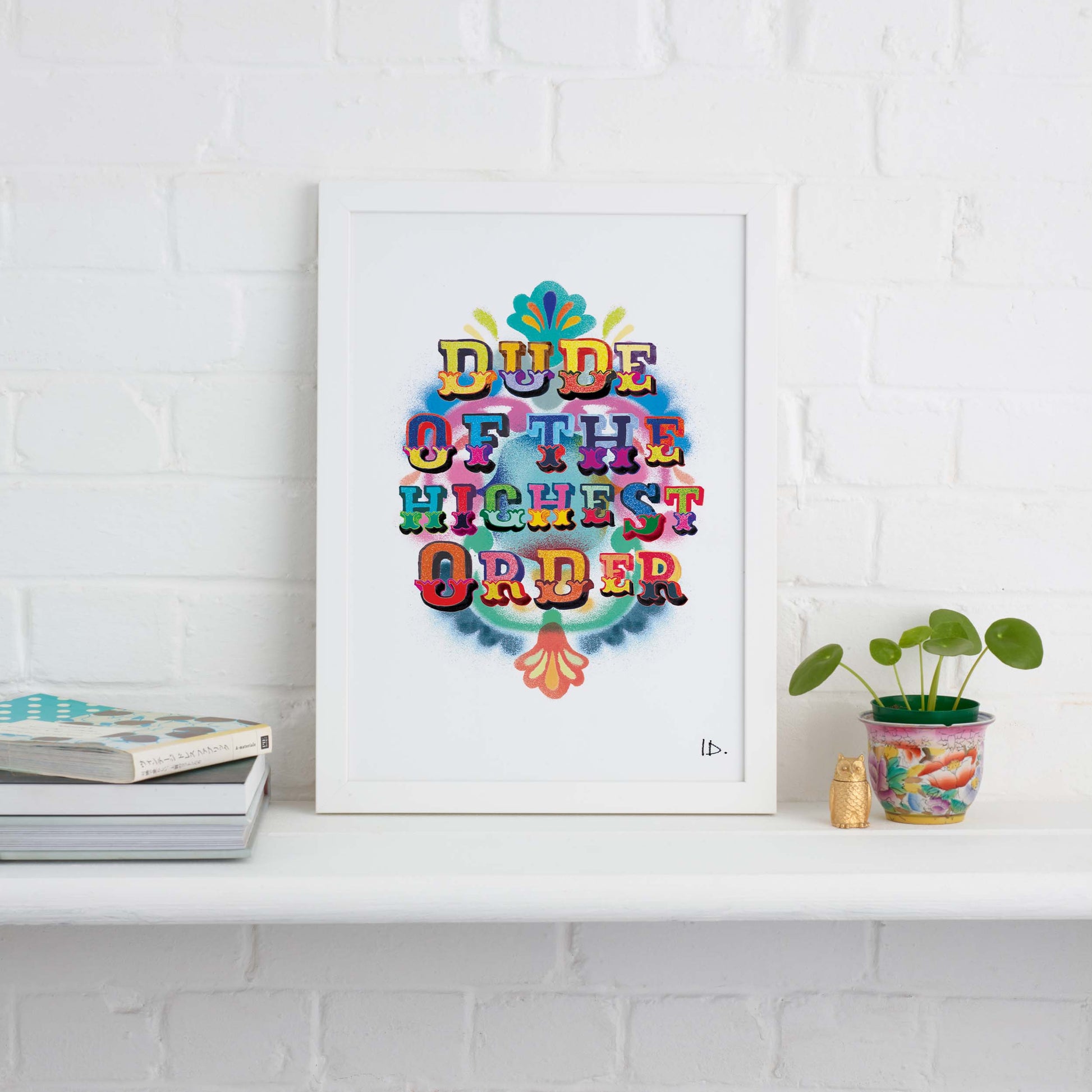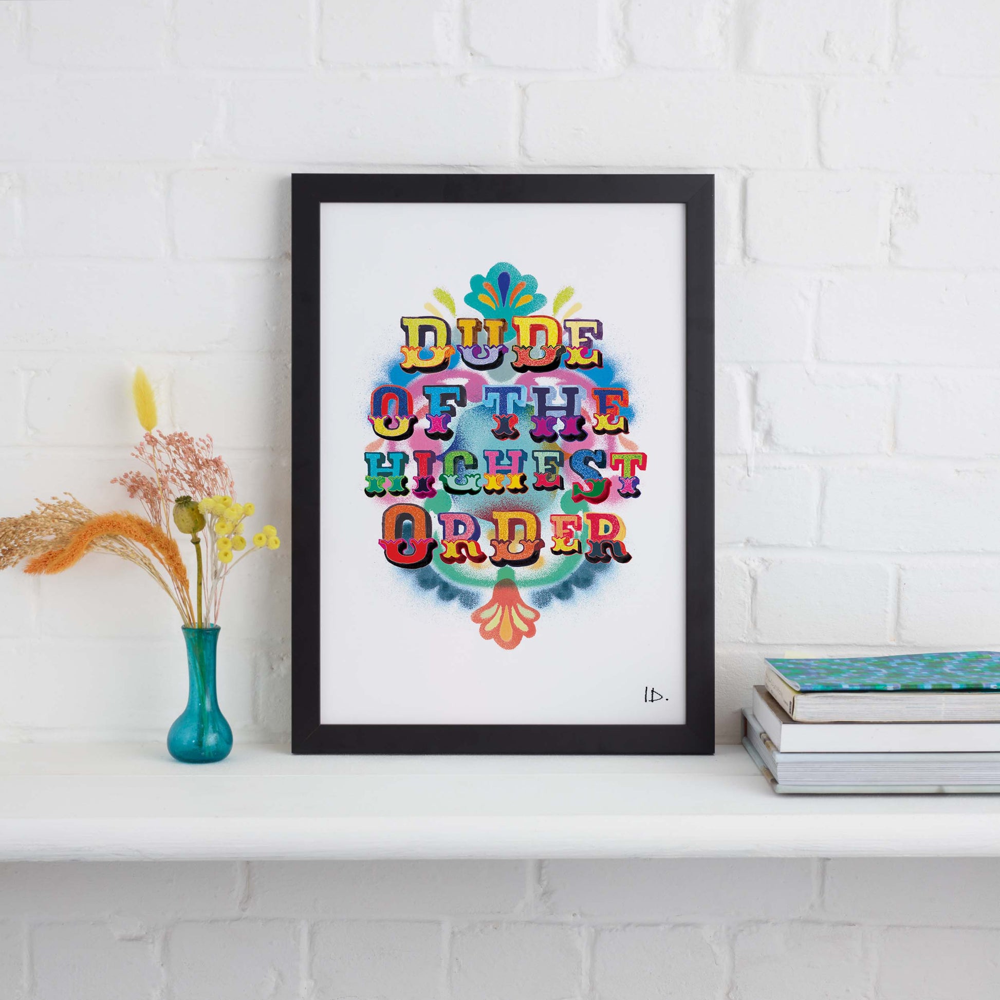 Grab this fun and vibrant typography print, Dude Of The Highest Order.