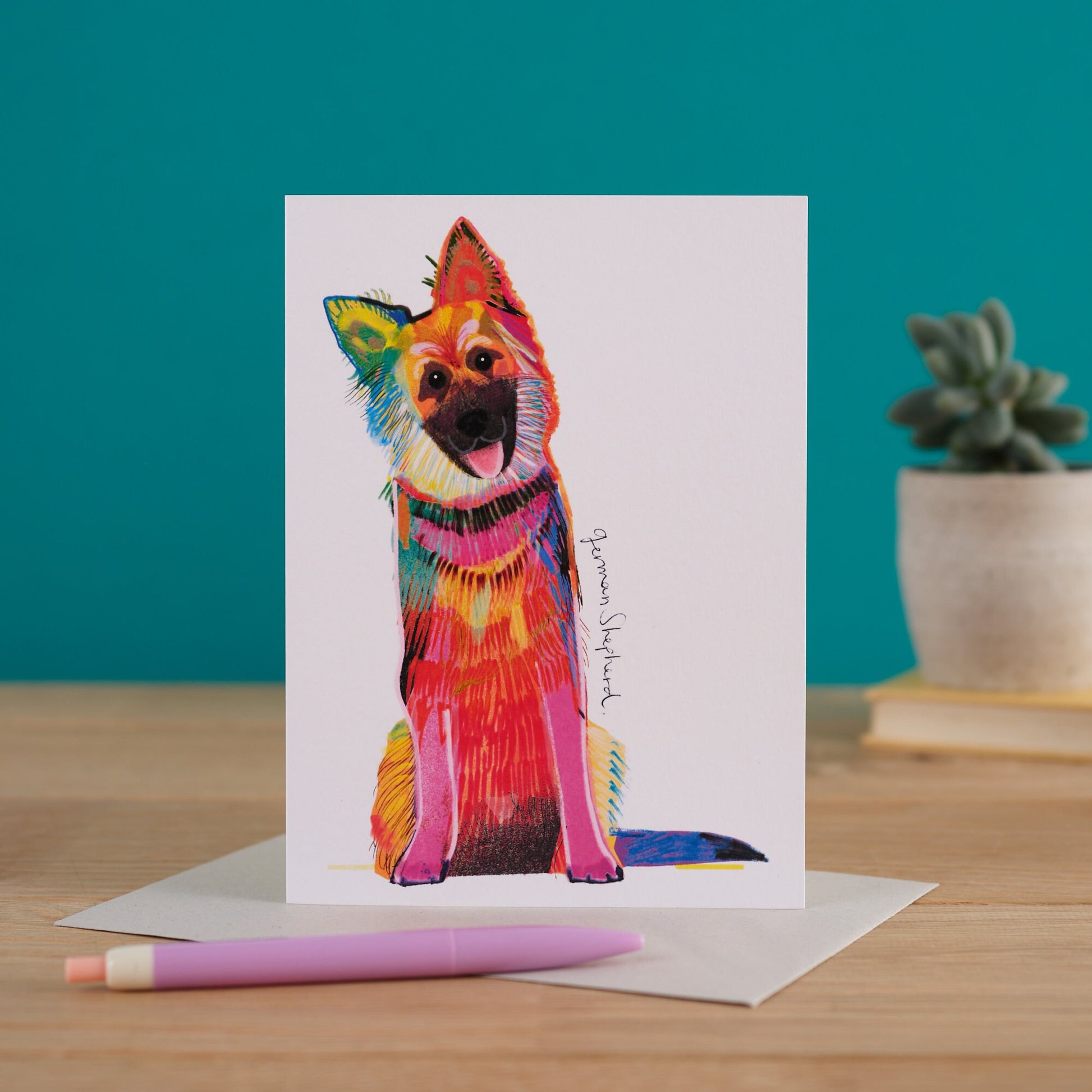 Grab this Loveable German Shepherd Greetings Card in Ilona's Signature style. The cutest illustration to send out to loved ones (dogs included)