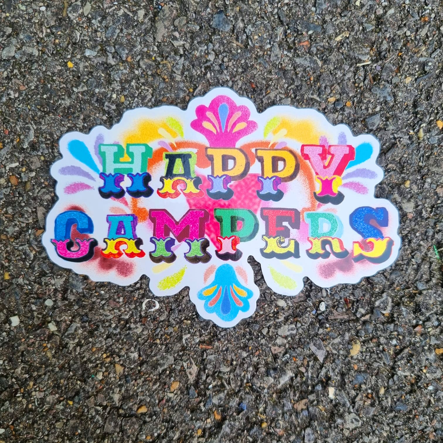 Grab this fun and vibrant typography Happy Campers Sticker. A fun way to decorate and personalise laptops, windows, and more.