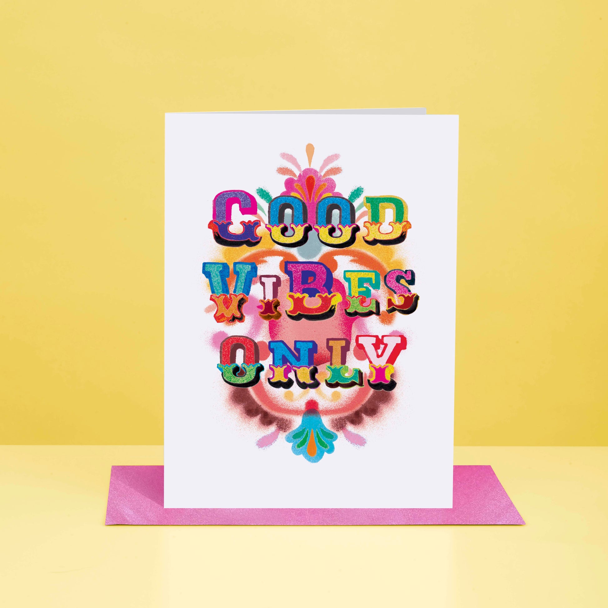 Grab this fun and vibrant typography Good Vibes Only Greetings card.