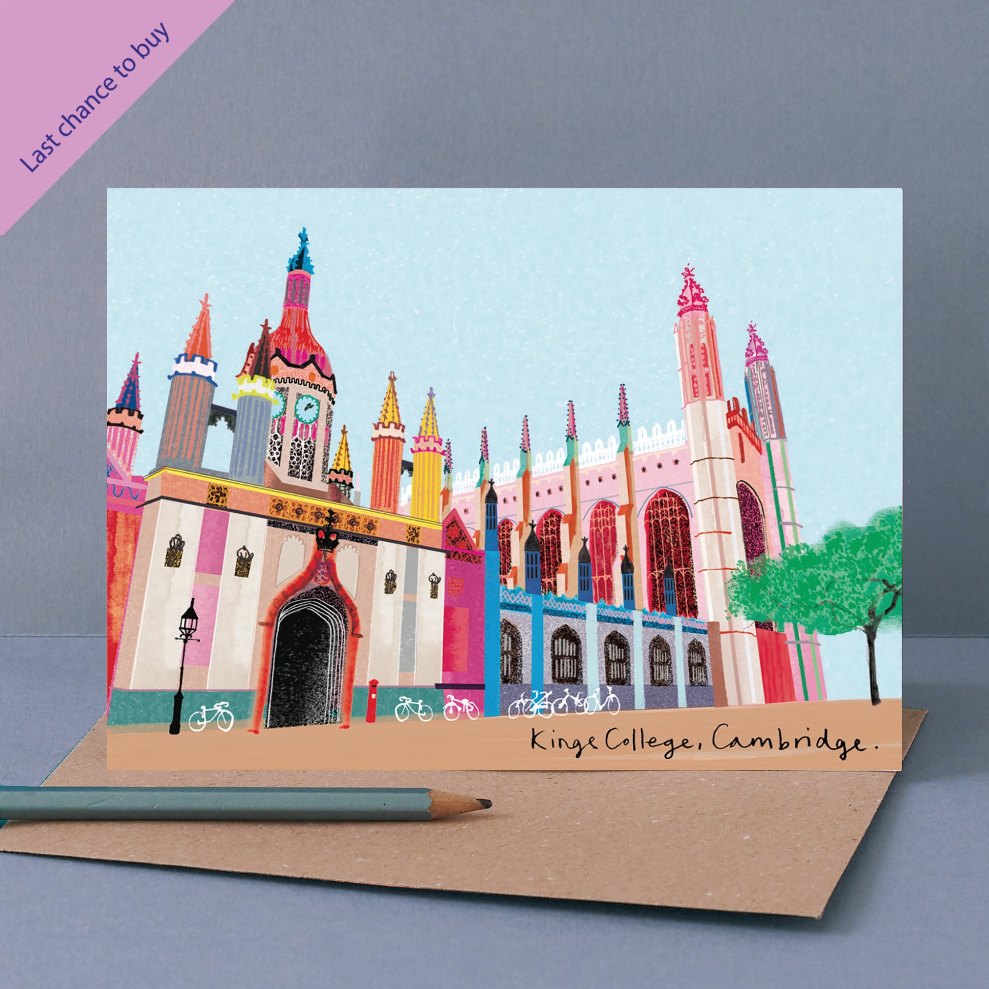 Uniquely designed by Ilona Drew this stunning card featuring Kings College Cambridge has been printed in the UK on quality 350gsm board.
