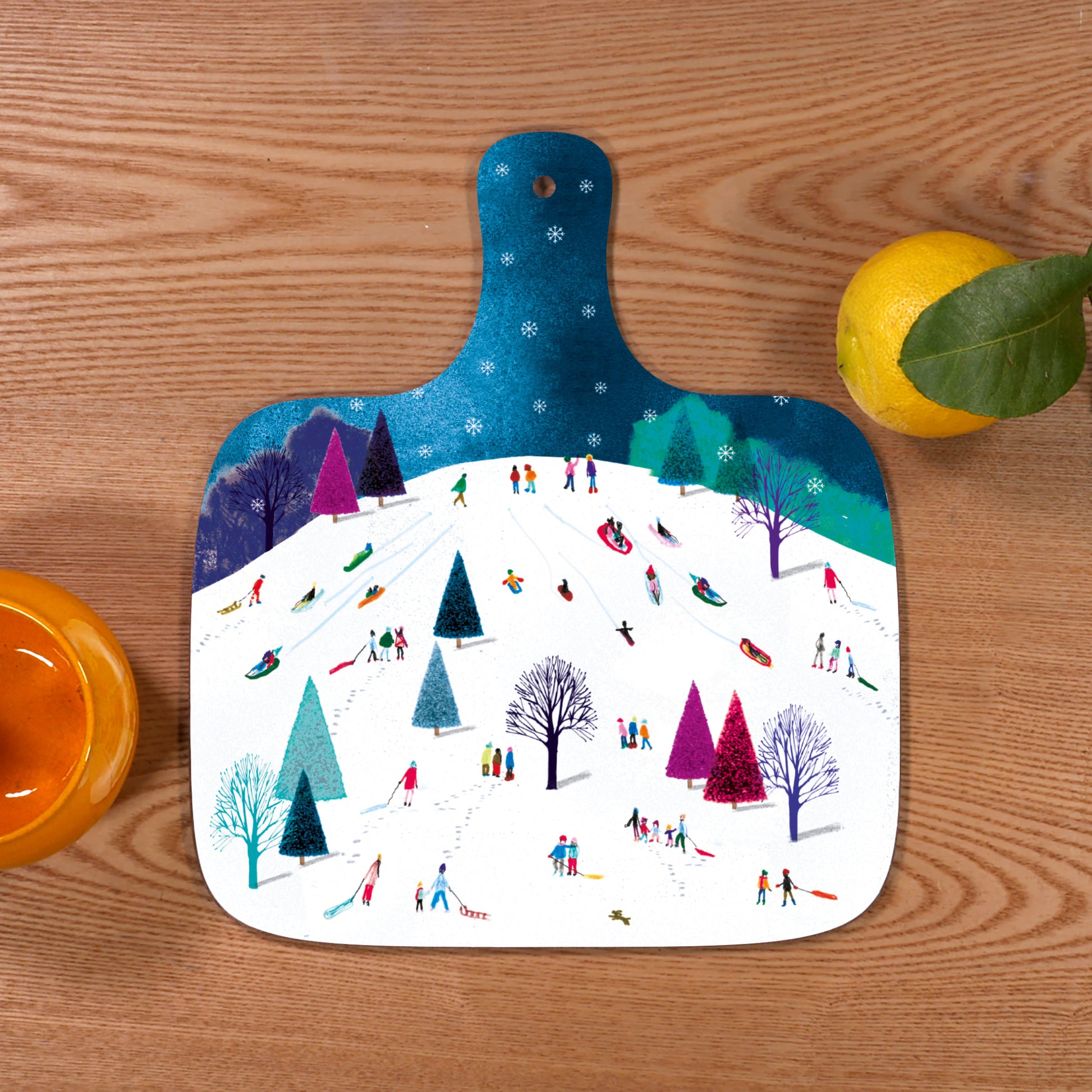 The Christmas Sledging Chopping Board features a joyful festive scene by Ilona in her unique colourful style.