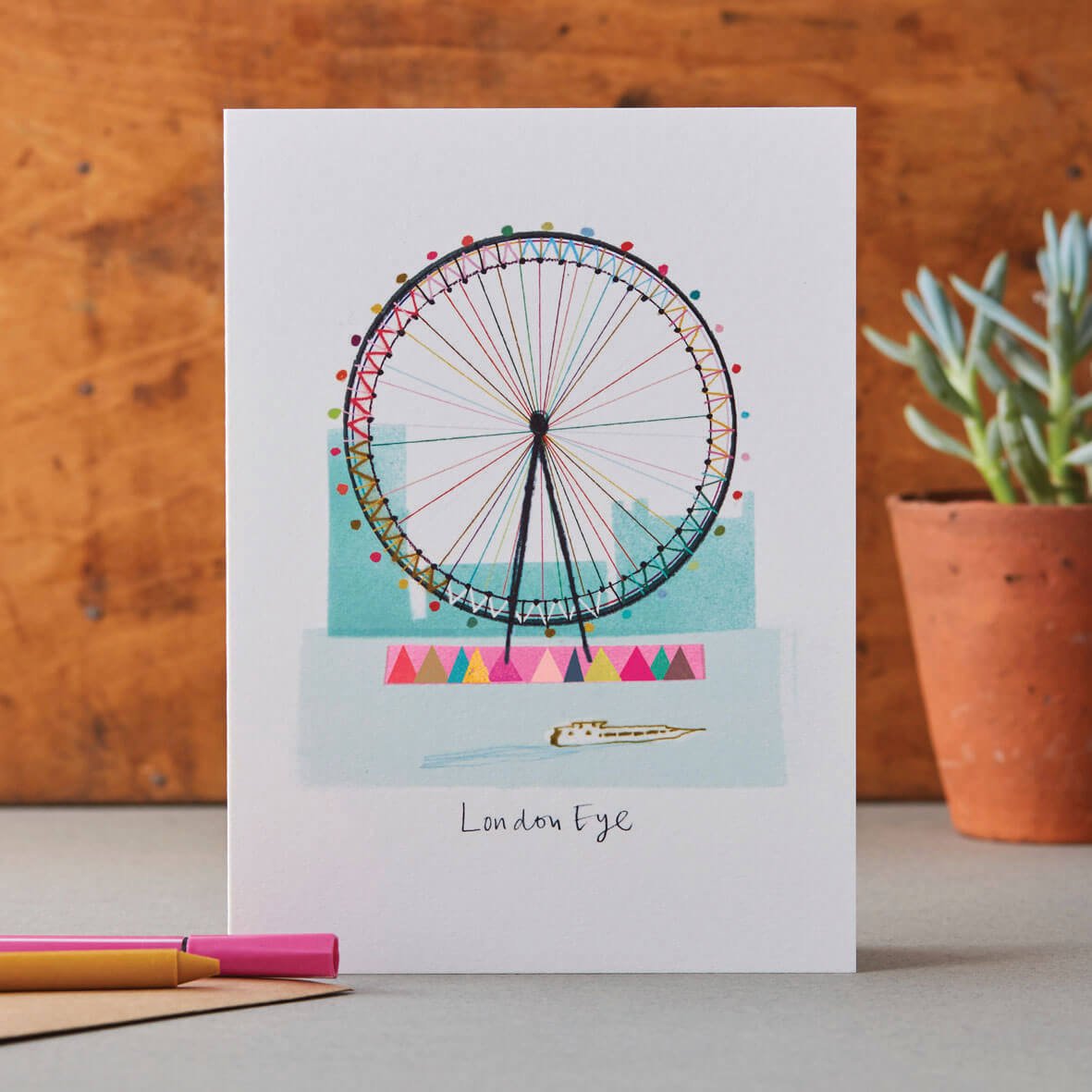 Uniquely designed by Ilona Drew this stunning card featuring the London Eye has been printed in the UK on quality 350gsm board and measuring 178mm x 130mm.