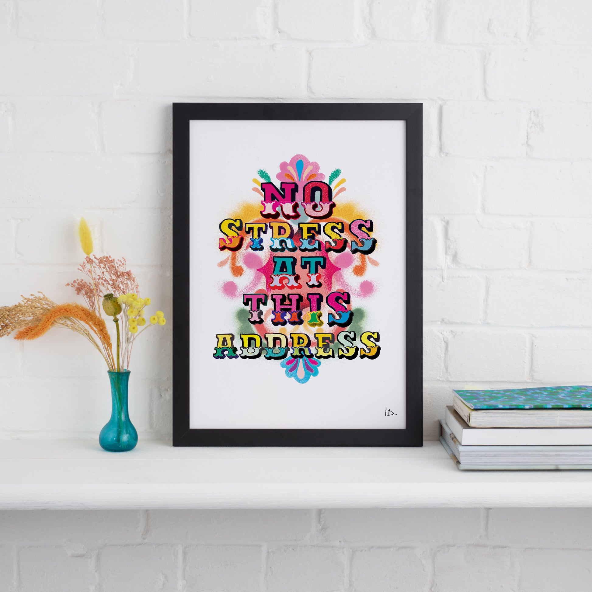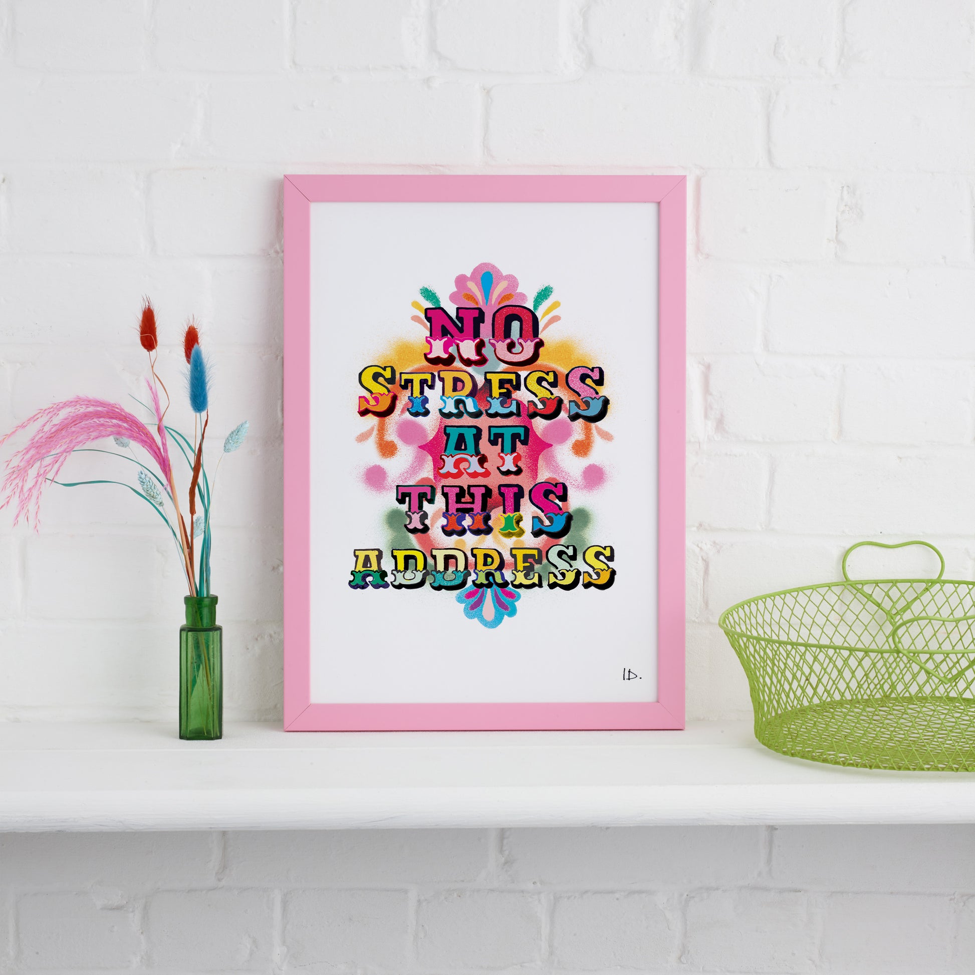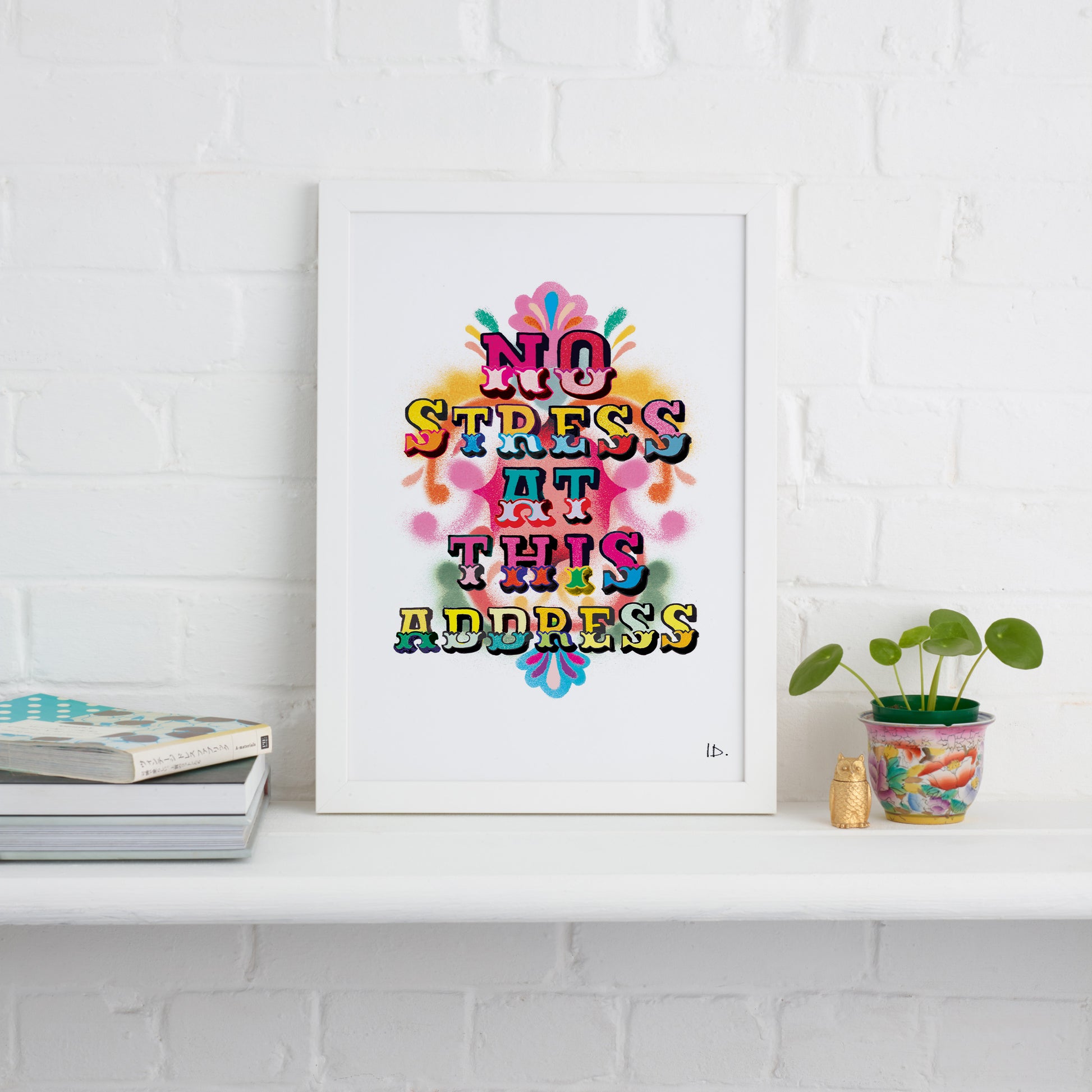 Grab this fun and vibrant typography print, No Stress At This Address.