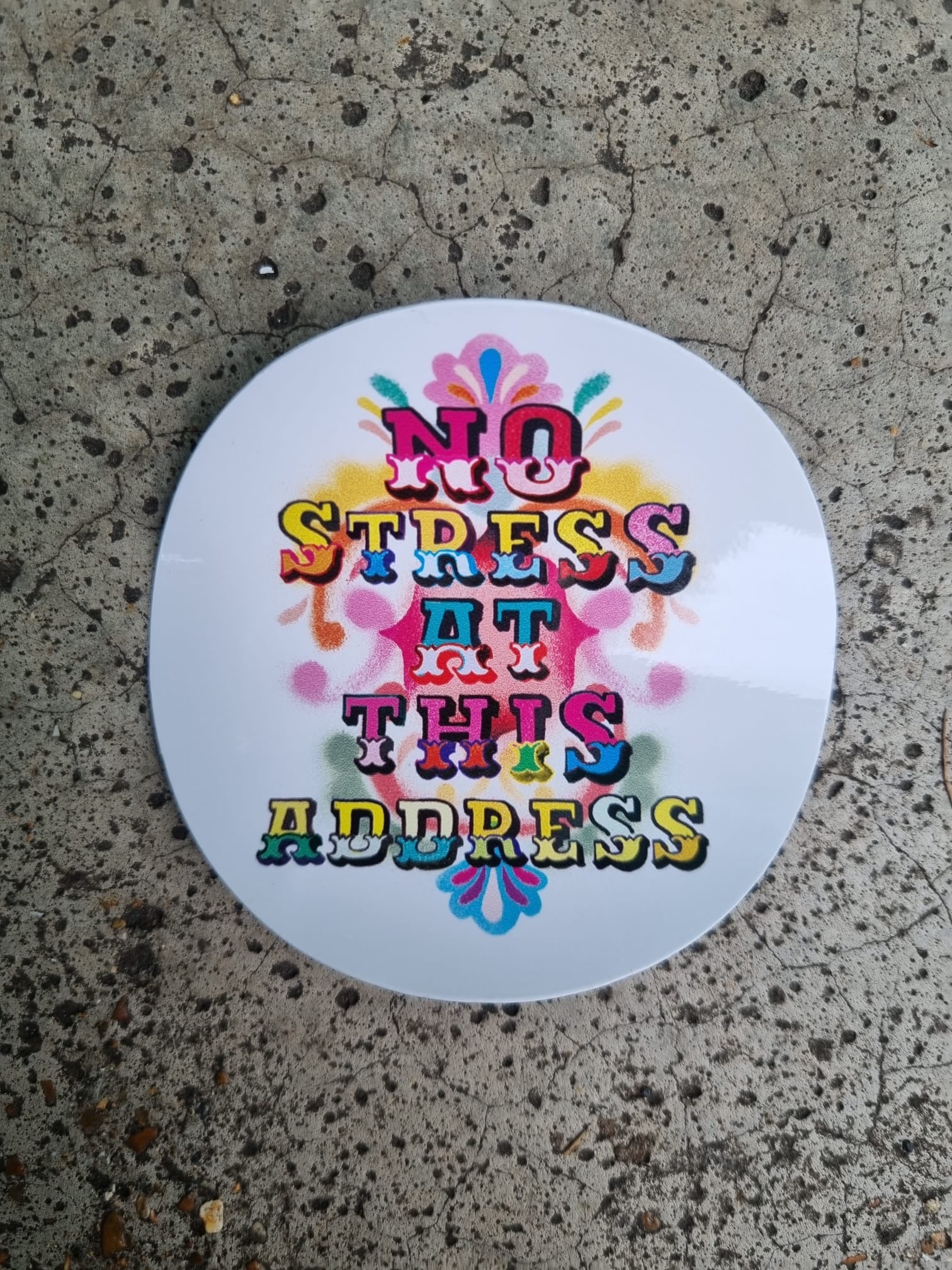Grab this fun and vibrant typography No Stress At This Address Sticker. A fun way to decorate and personalise laptops, windows, and more.