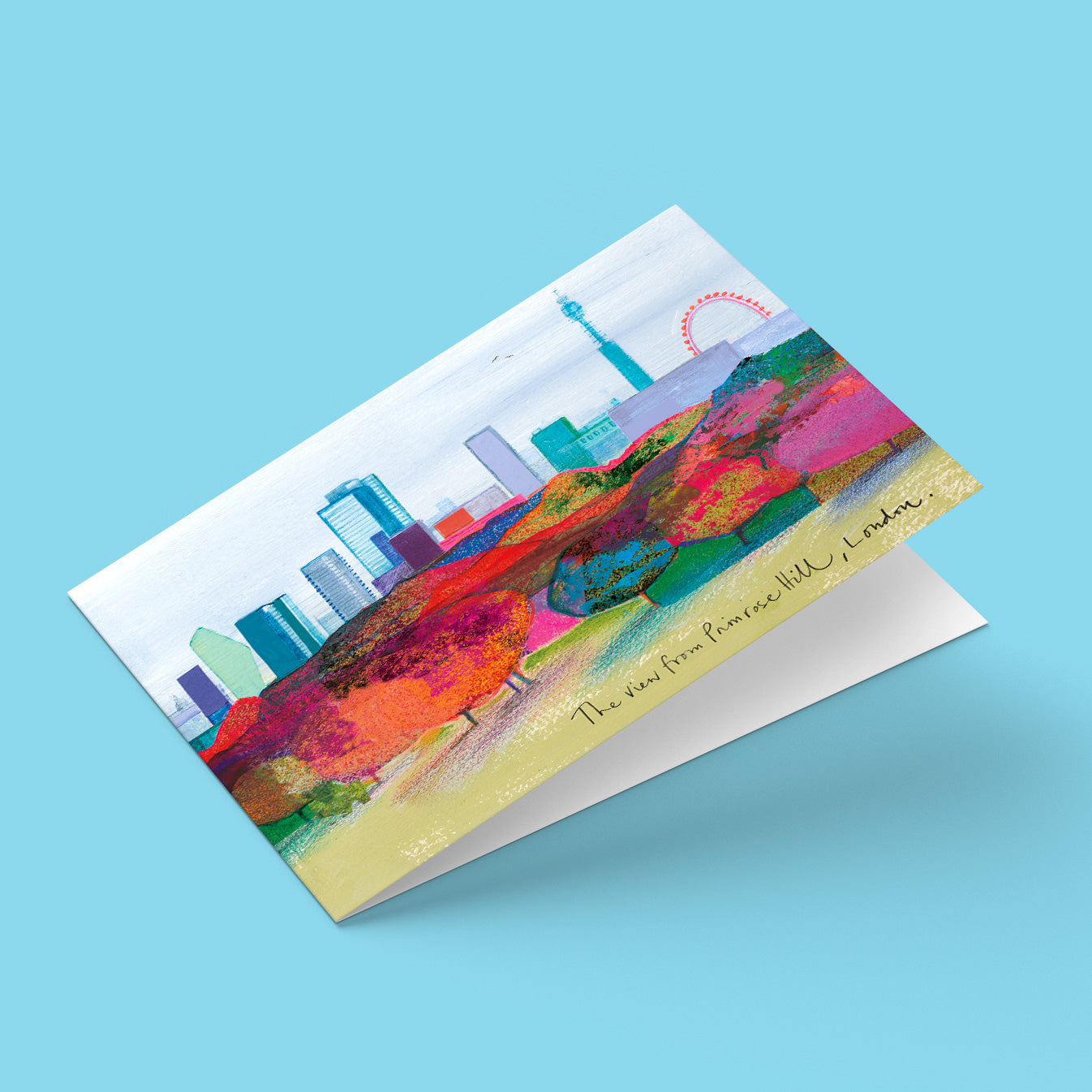 The view from Primrose Hill of London has been captured in beautiful colours in Ilona's illustration. Capturing landmarks such as The Shard, The Walkie Talkie, BT Tower and the London Eye. This card showcases the view over the front and the back page to really make a wow card.