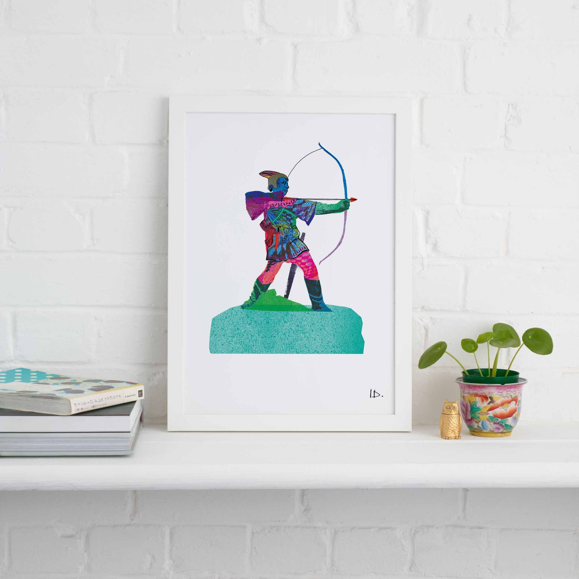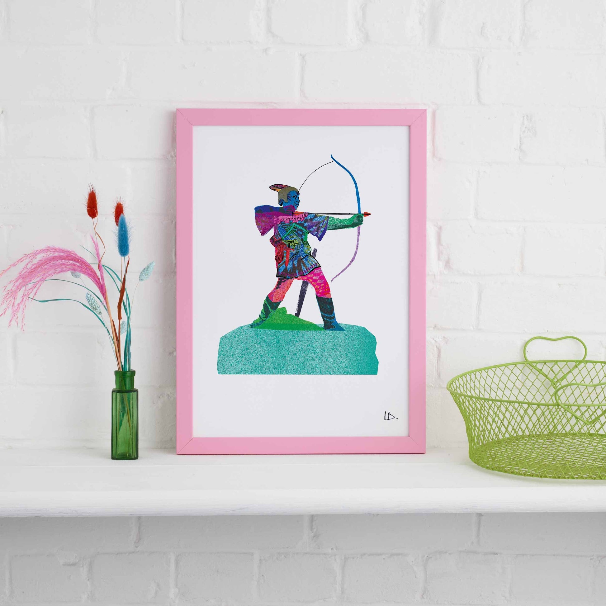 The Robin Hood Statue in Nottingham has been captured in beautiful bright colours in Ilona's illustration of the iconic Statue in Nottingham, England.