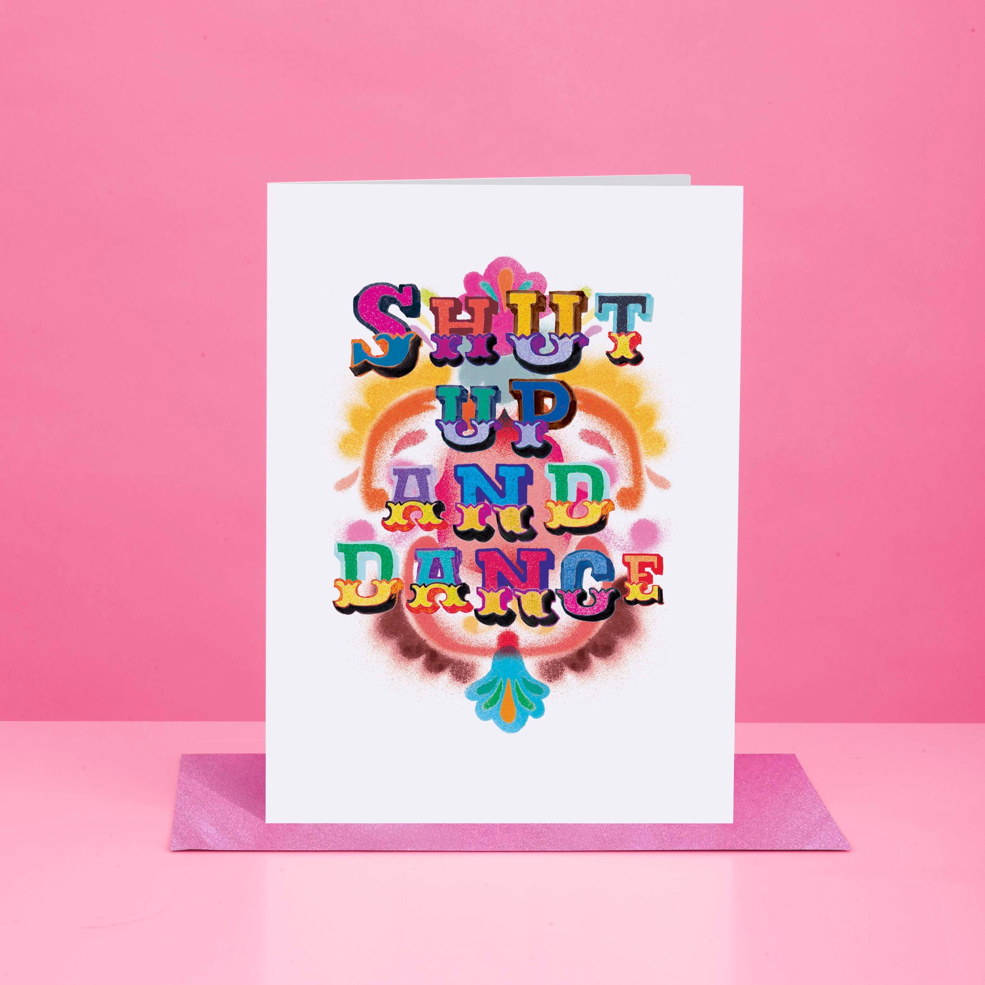 Grab this fun and vibrant typography Shut Up And Dance Greetings card.