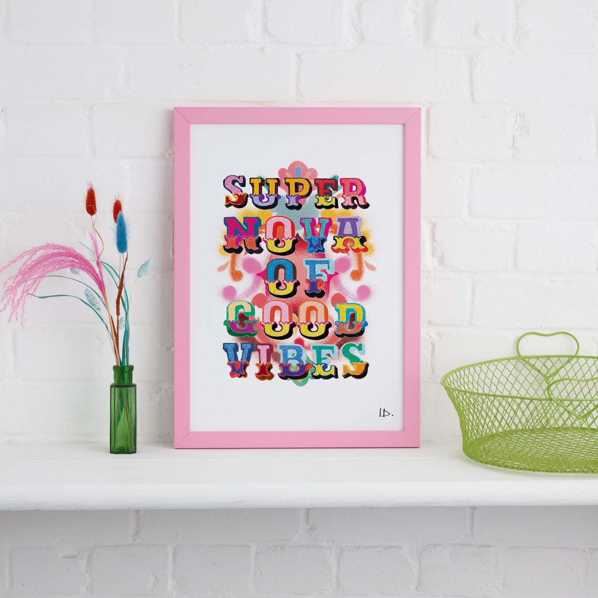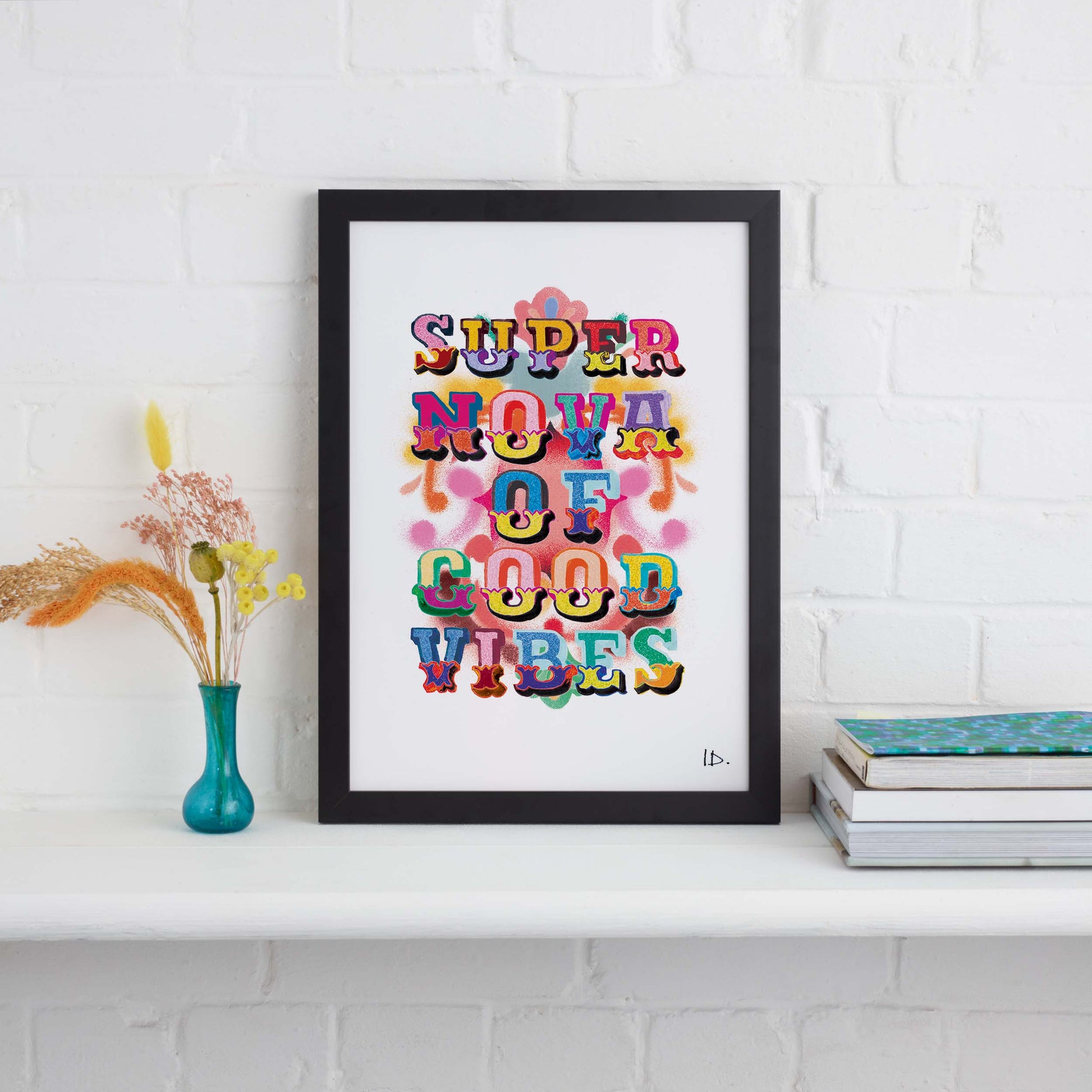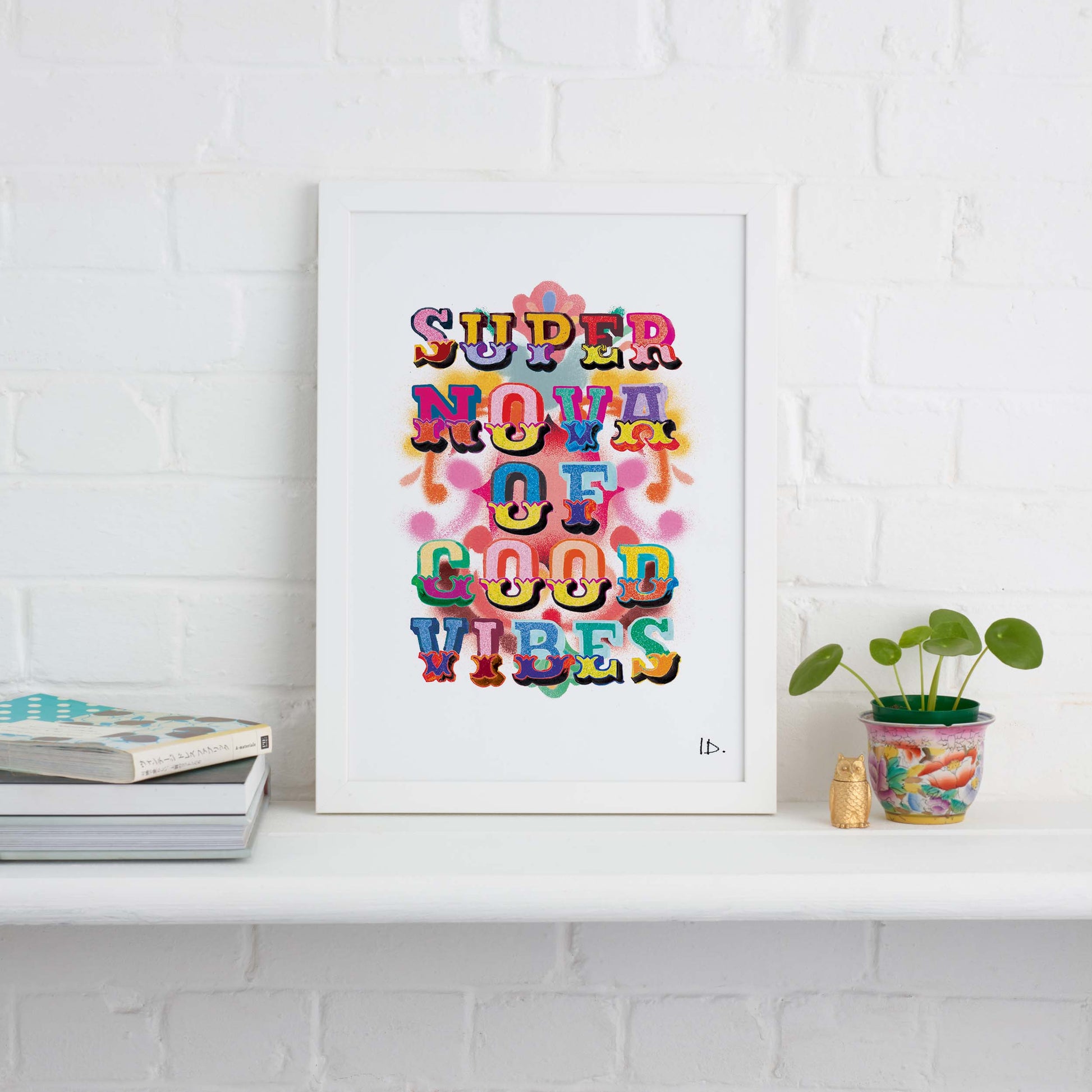 Grab this fun and vibrant typography print, Supernova Of Good Vibes.
