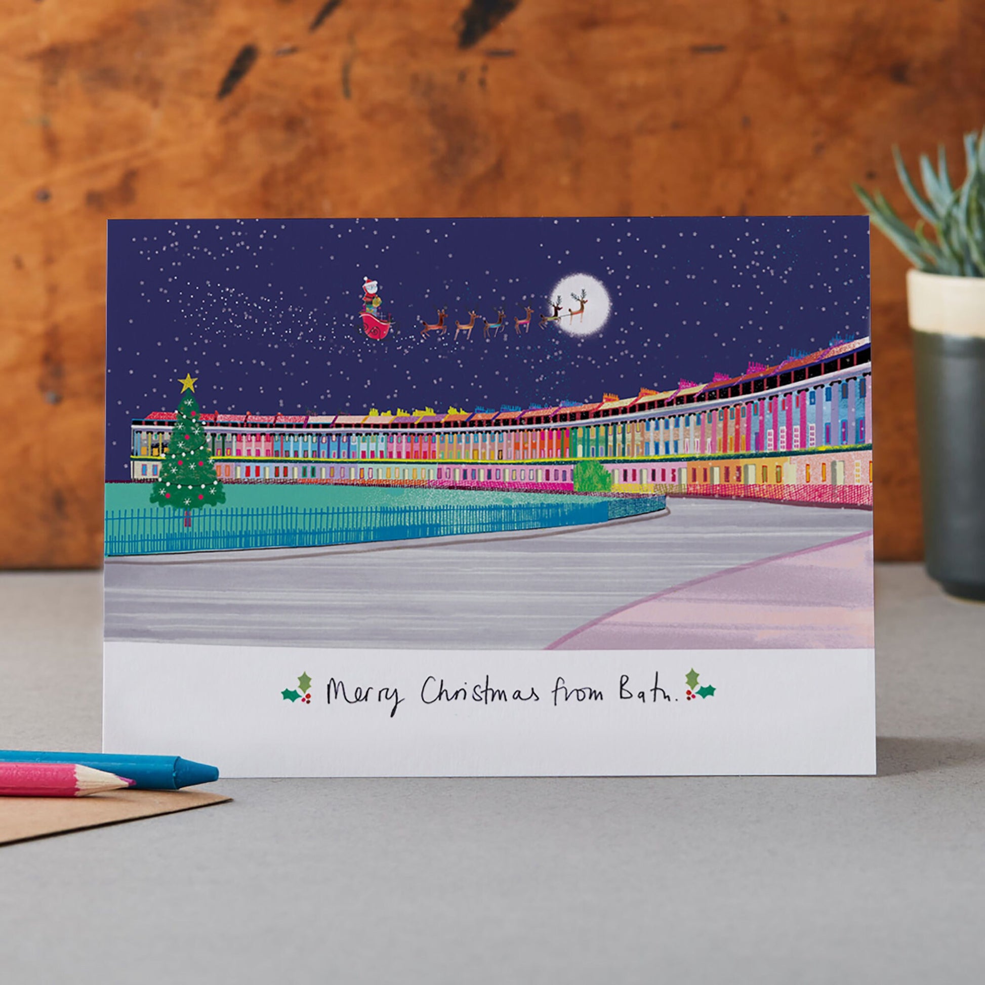 The Crescent in Bath is looking beautiful and Festive in rainbow colours in Ilona's illustration of the historic landmark in Bath, With a special visitor flying over head.